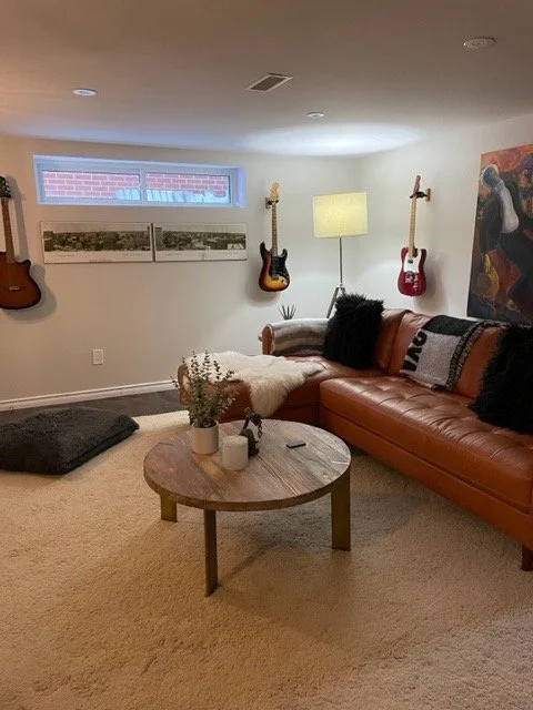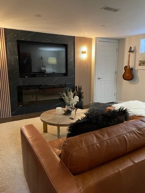 This inviting basement renovation brings a fresh interpretation of the home’s existing design style while introducing a warm caramel colour palette. A striking linear electric fireplace wall anchors the space, finished with floor-to-ceiling tile and framed by maple wood slat detailing and elegant sconces. Existing luxury vinyl flooring was complemented with a plush area rug to enhance comfort. Designed as a multifunctional retreat, the rec room blends media, music, and relaxation areas into a cohesive, stylish space.