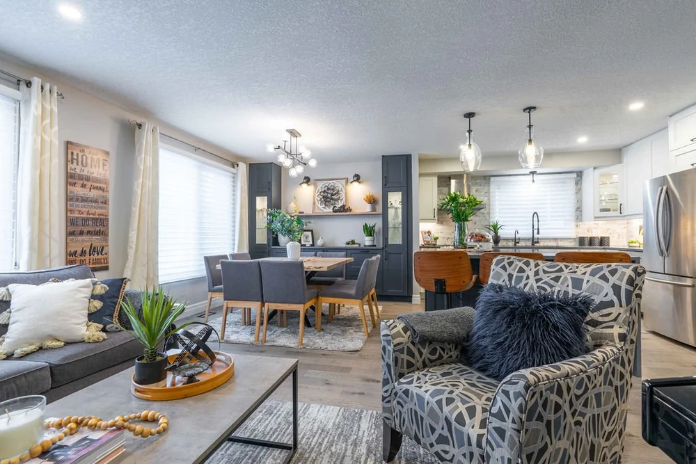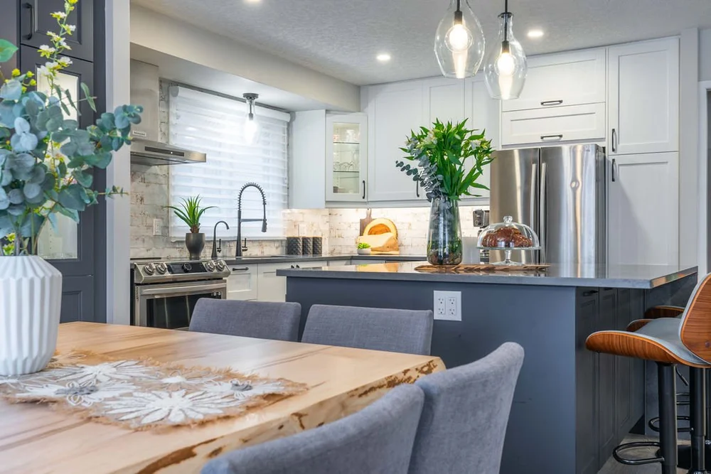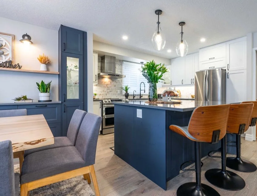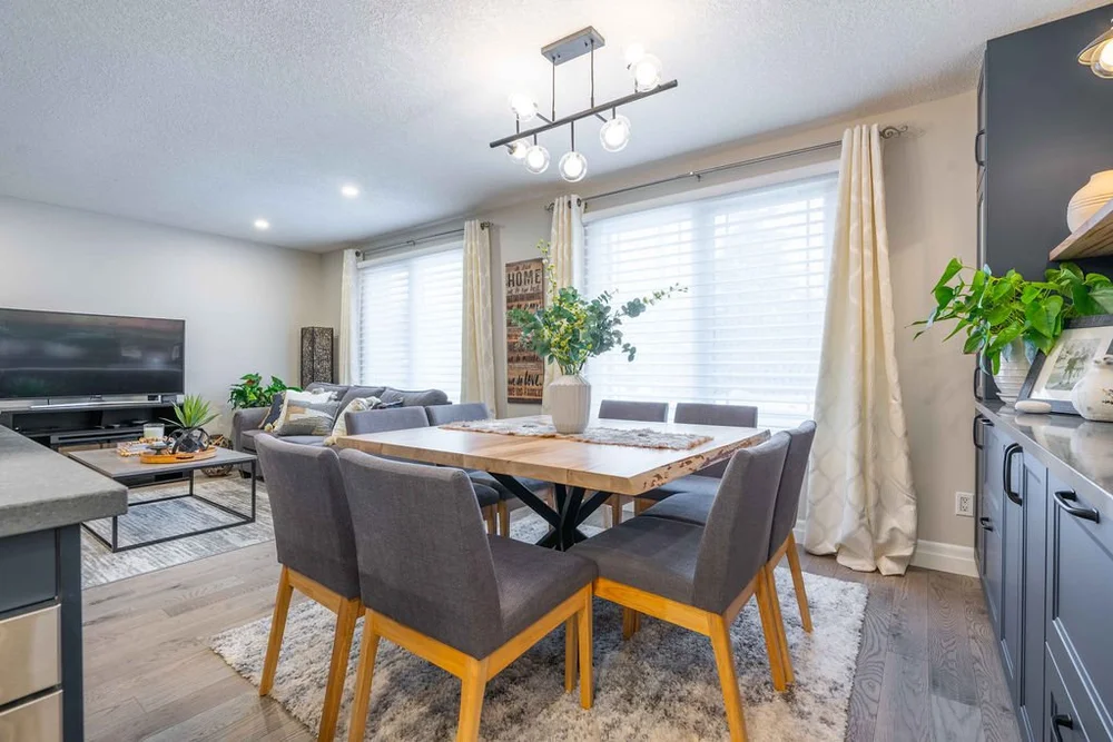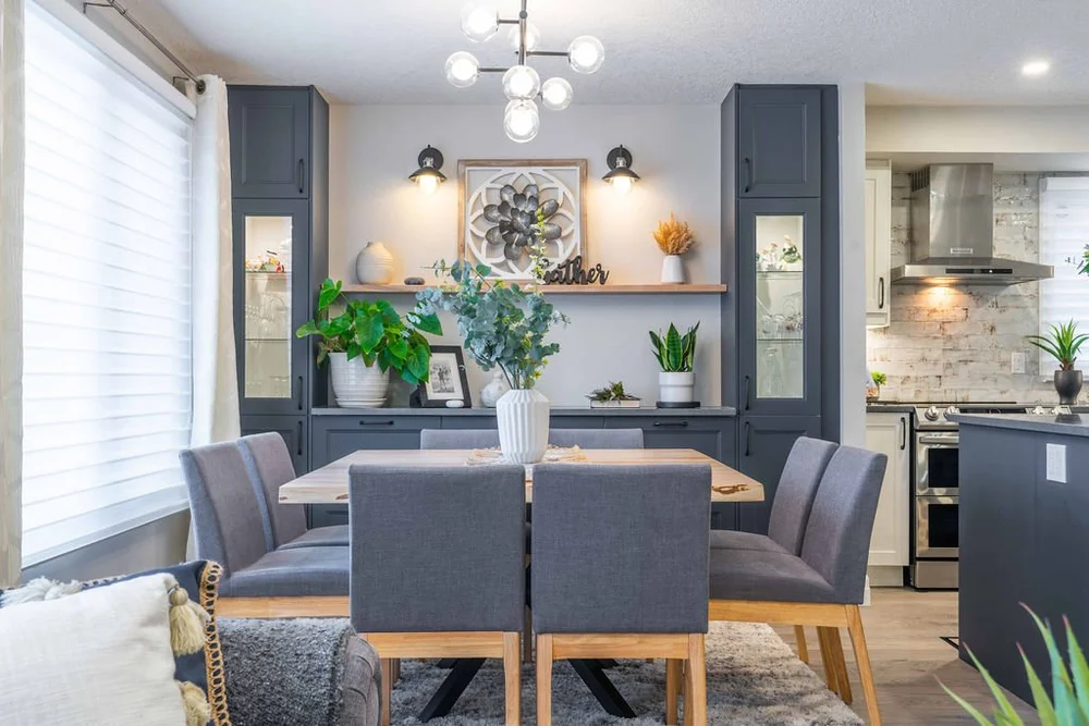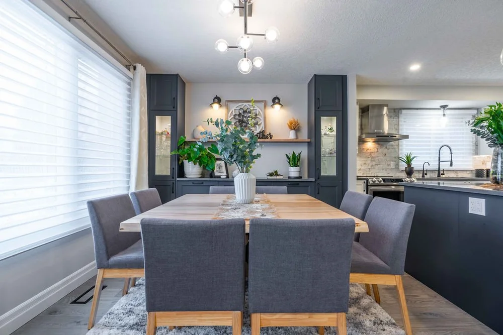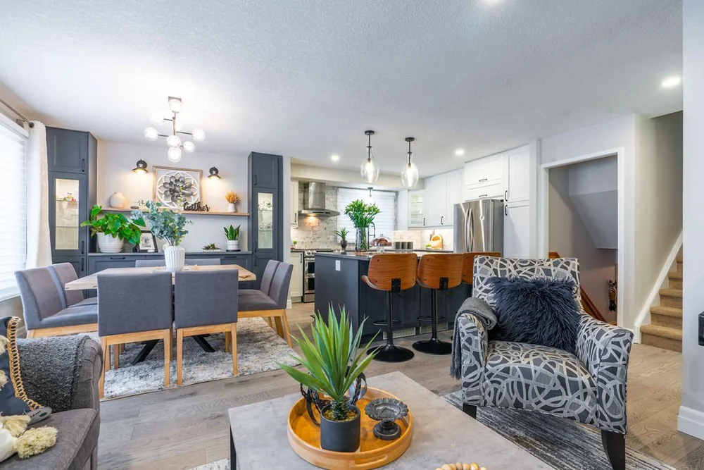 A warm, modern main-floor renovation featuring a custom kitchen and elegant dining space.