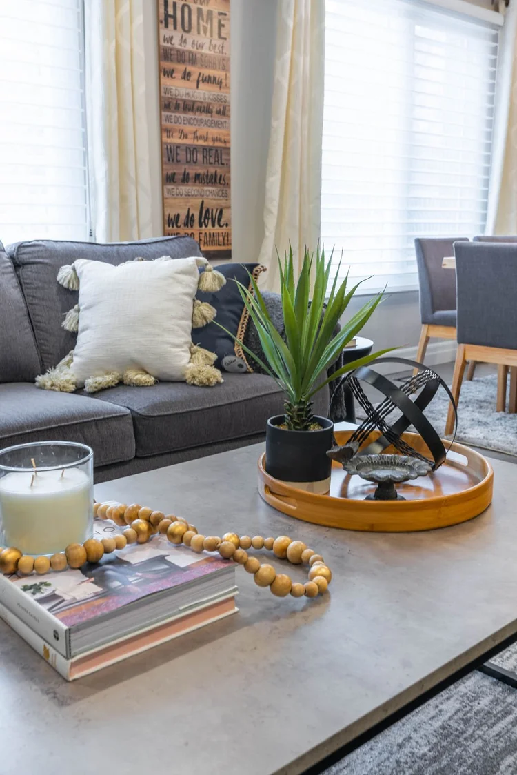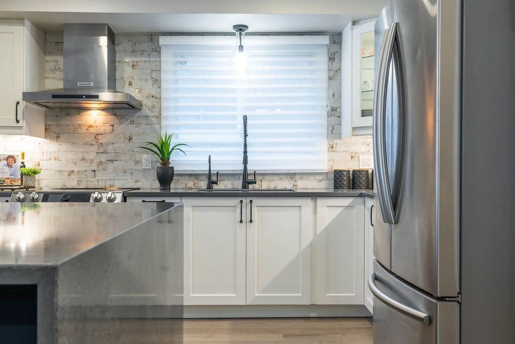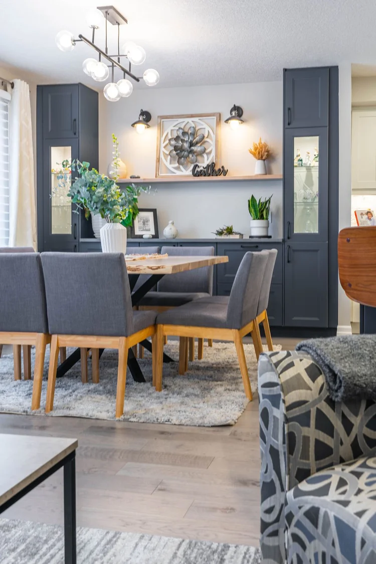 Main-floor renovation including kitchen design, custom dining built-ins, lighting plan, flooring and staircase installation, paint selection, custom furniture design, window coverings, custom coat rack, trade coordination, and styling.